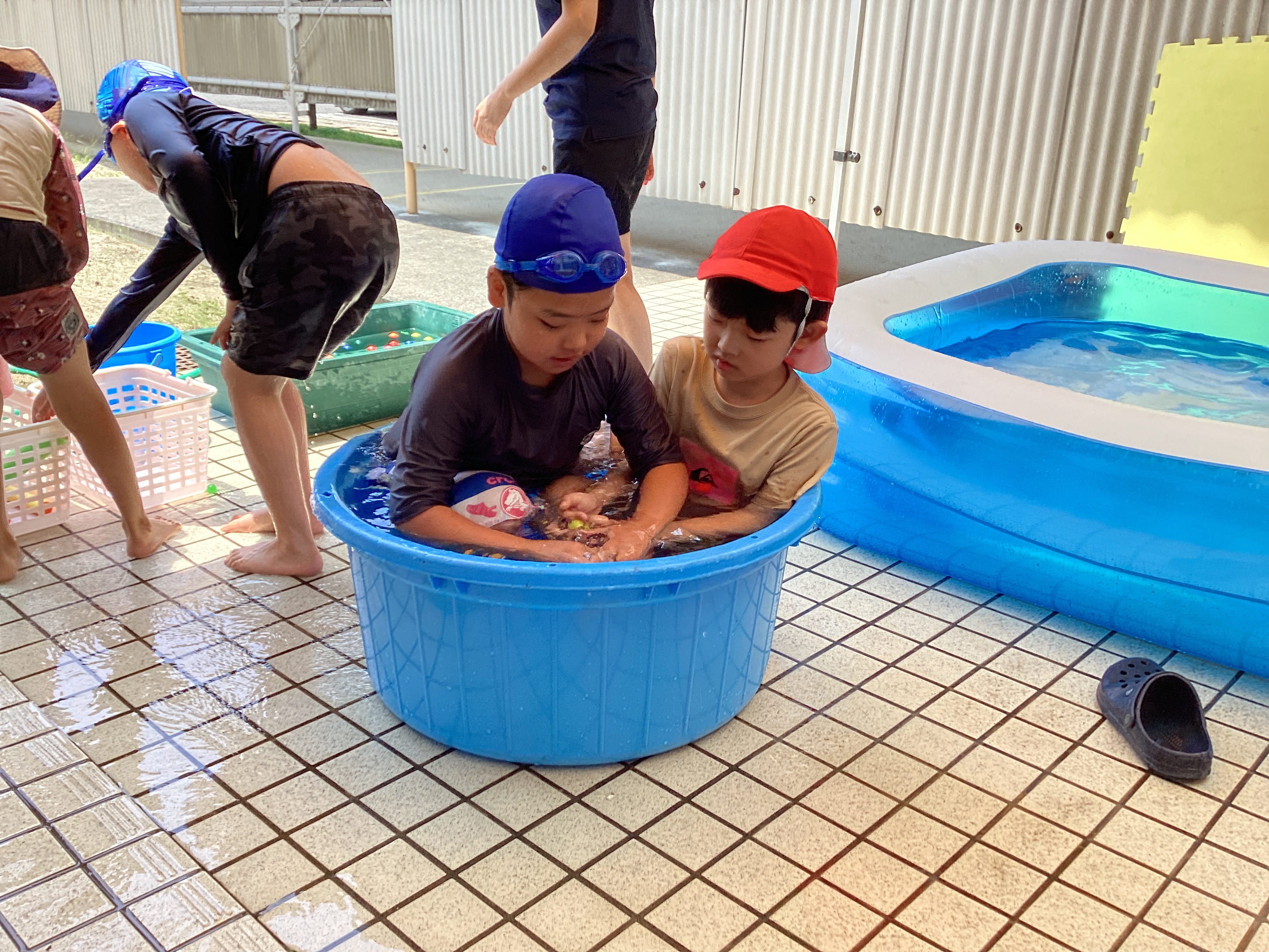 7月になったばかりですが、まるで真夏のような猛暑が続いていますね。そんな中、桃組、桜組の児童は水遊びをして楽しみました。水鉄砲で遊んだり、水の中に潜ったりして、暑さを忘れるような気持ちよさでした。