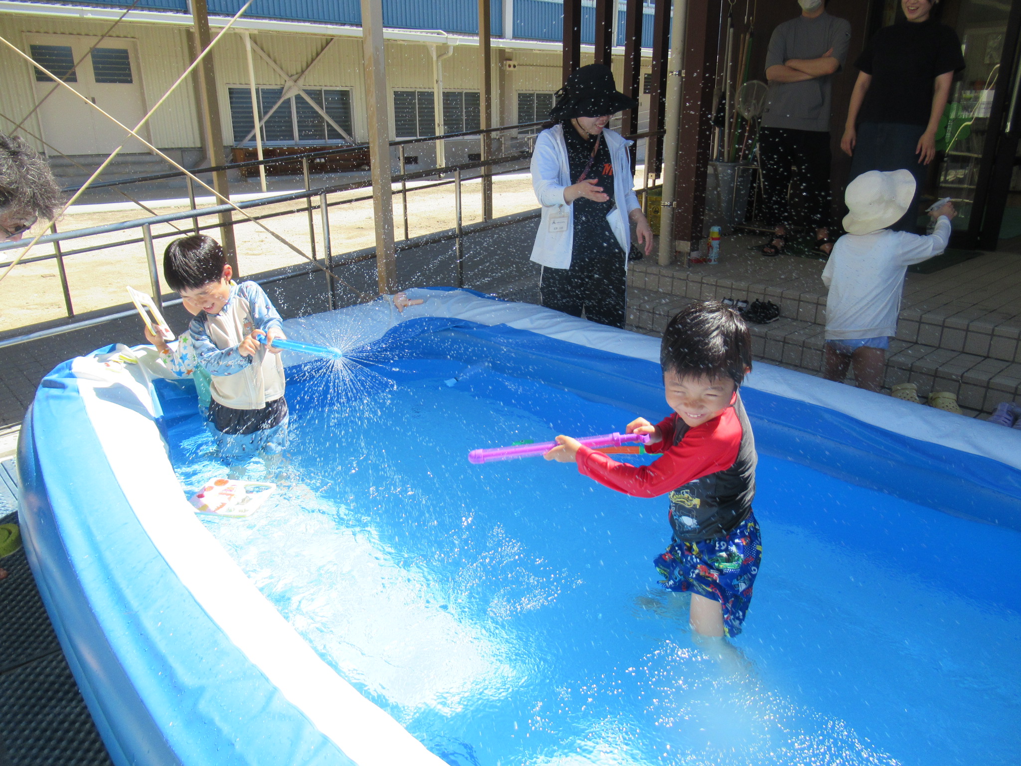 2025年7月25日 15時00分今夏も幼稚部サマースクールで「水遊び」を楽しみました。外部からの参加もあり、手作りのウォータースライダー、石鹸・泡遊び、色水遊びなどをしました。スイカ割りやかき氷で体を冷やし、みんなで談笑もしました。